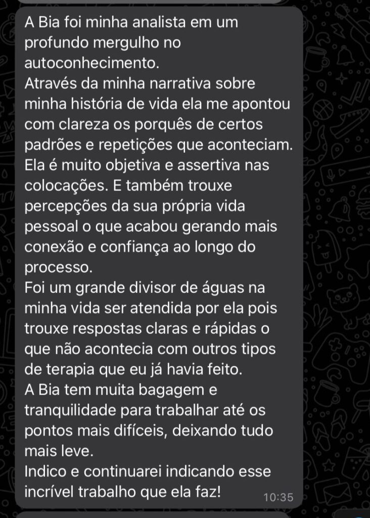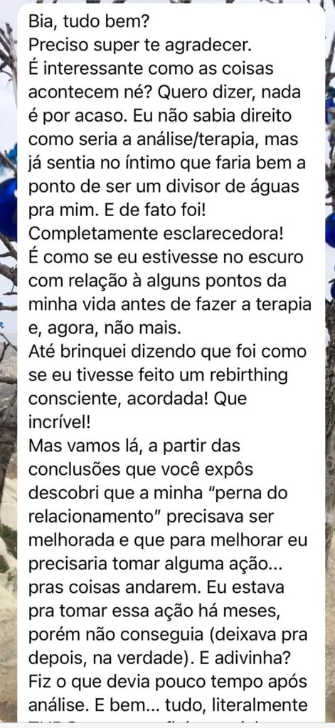 Mas fique à vontade para me chamar de Bia. Eu sou uma eterna estudante do comportamento humano, e estou nessa jornada há mais de 14 anos transformando a vida de mulheres que não conseguem enxergar um ponto claro para o que vivem. Além disso, sou Analista Corporal formada pelo O Corpo Explica, e trabalhei à frente de um trabalho onde eu tratava os mais diversos casos de esgotamento mental, e não houve nenhum paciente que não tenha saído com uma questão resolvida.